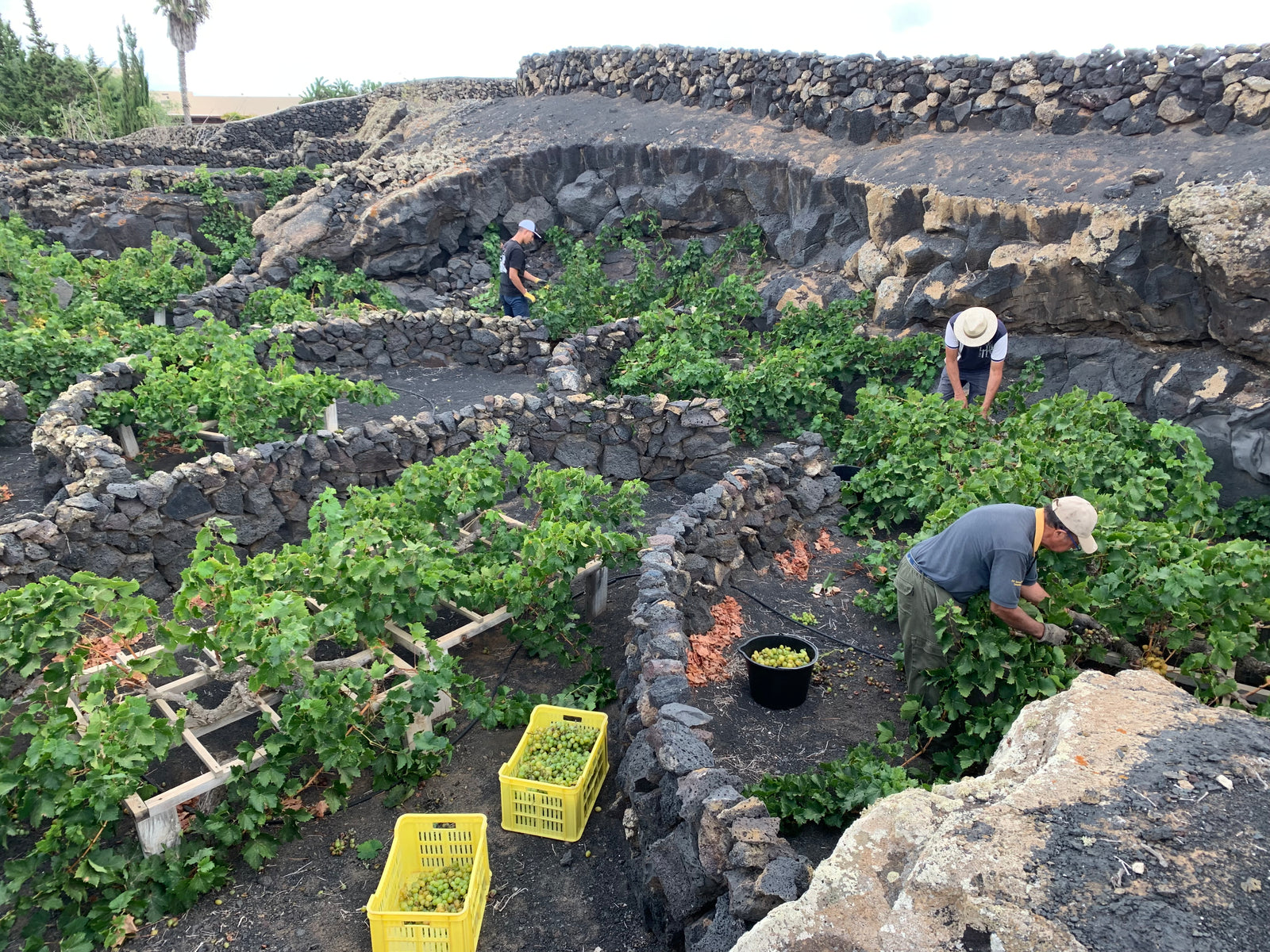 The Harvest is the first in Europe, usually from mid-July. Harvest is a very manual exercise in the heat of the summer. It´s a rule set by the Denominacion de Origen, not least because of the impassable landscape, but importantly it ensures quality. Picking by hand ensures that only the premium bunches are harvested, and then they are carefully placed in a basket containing approximately 20 Kg. This ensures the grapes are not damaged and arrive to the winery in perfect condition. You will see harvesting at first light when the conditions are at their coolest. We always get enough sun on the Island, so quality is high year after year, but one thing that does change drastically is the annual yield. A lot depends on the winter weather, for example, in 2016 we had a yield of just 696,000 Kg and then 3,943,000 Kg in 2018, which was a record year for collection.